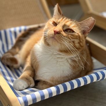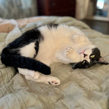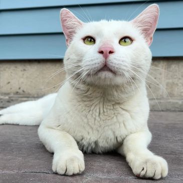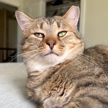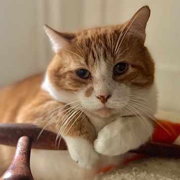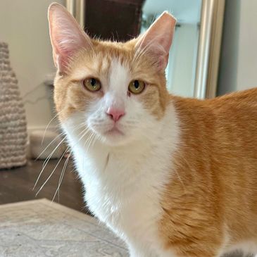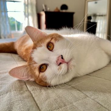 Buster is the newest addition to the cat crew. He showed up on our property in the summer of 2025, very fearful and very thin. For weeks, we often saw him walking up and down our street. After feeding him consistently on our property and getting him neutered a few months later, Buster decided to give us humans a chance and warmed right up! He then craved constant attention from us, appearing to be quite lonely outside, which is when we transitioned him indoors with the other cats. Safe to say, he is now loving his newfound companions and is such a sweet boy who loves belly rubs.