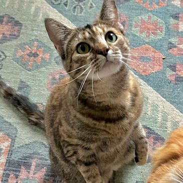 Peep & her brother, Beaux, were born into a cat colony a few towns over, and we took them in as kittens at about 10 weeks old. Peep is a lot more reserved than her brother. She can be nervous around new people and fast movements, but she constantly craves affection from the other kitties. Like her brother, she almost always has to be cuddled up with another cat.
