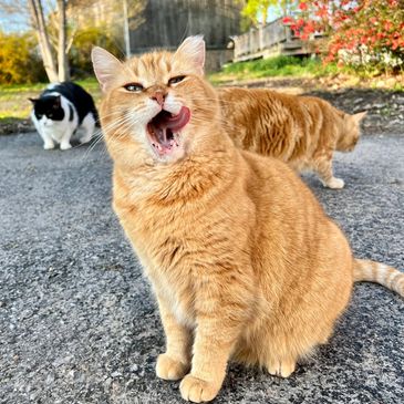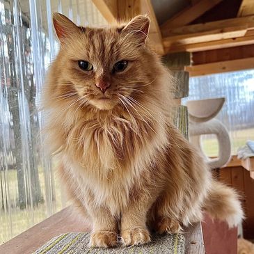 Buster is the newest addition to the cat crew. He showed up on our property in the summer of 2025, very fearful and very thin. For weeks, we often saw him walking up and down our street. After feeding him consistently on our property and getting him neutered a few months later, Buster decided to give us humans a chance and warmed right up